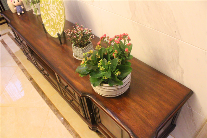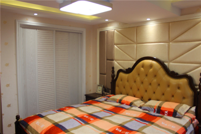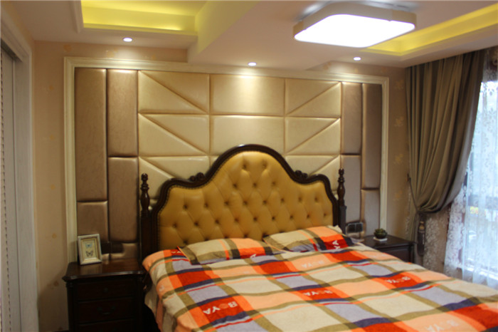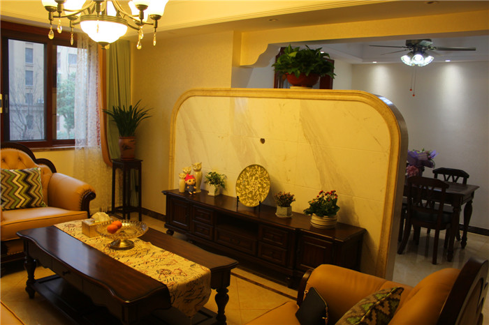 简约美式风格不需要太多的花样和繁杂的色系,而是在主张简约的同时不失尊贵,强调一种心神的回归 。本案无论在空间布局、色彩运用上,还是在材质选择上,处处尊崇简而不凡的简约美式简约风格。实 木的家具,沉稳的皮具沙发,复古的电视背景墙,流露出一股浓浓的美洲风情.客厅深棕色的沙发,规整的地 面瓷砖拼花,瞬间给人一种尊贵之感;客厅和餐厅之间通透的背景墙设计,丰富了空间的层次感。卧室是业 主休息的空间,也是停留时间最长的地方,所以遵从了功能性和美观性相结合的原则。卧室的亮点是整 面皮革硬包的床头背景墙,这个造型与实木地板相呼应,增强了空间的开阔性。
