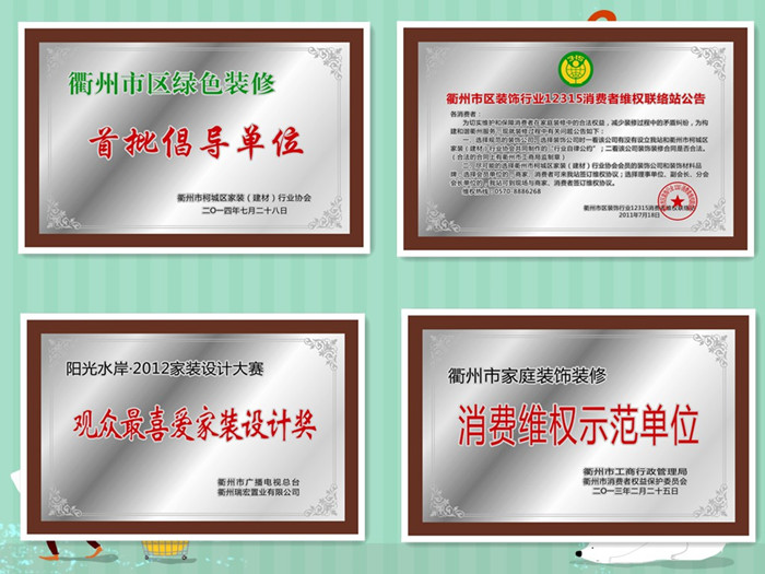 2011年被衢州市工商行政管理局评为衢州市家庭装饰消费维权示范单位;