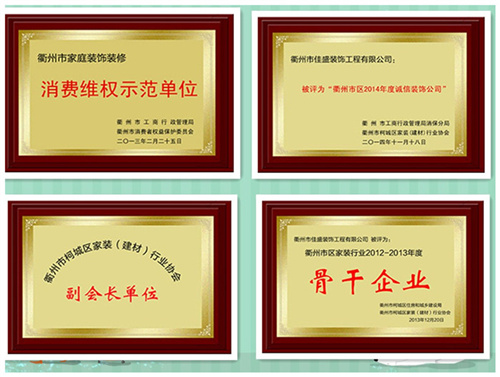 2011年被衢州市工商行政管理局评为衢州市家庭装饰消费维权示范单位;